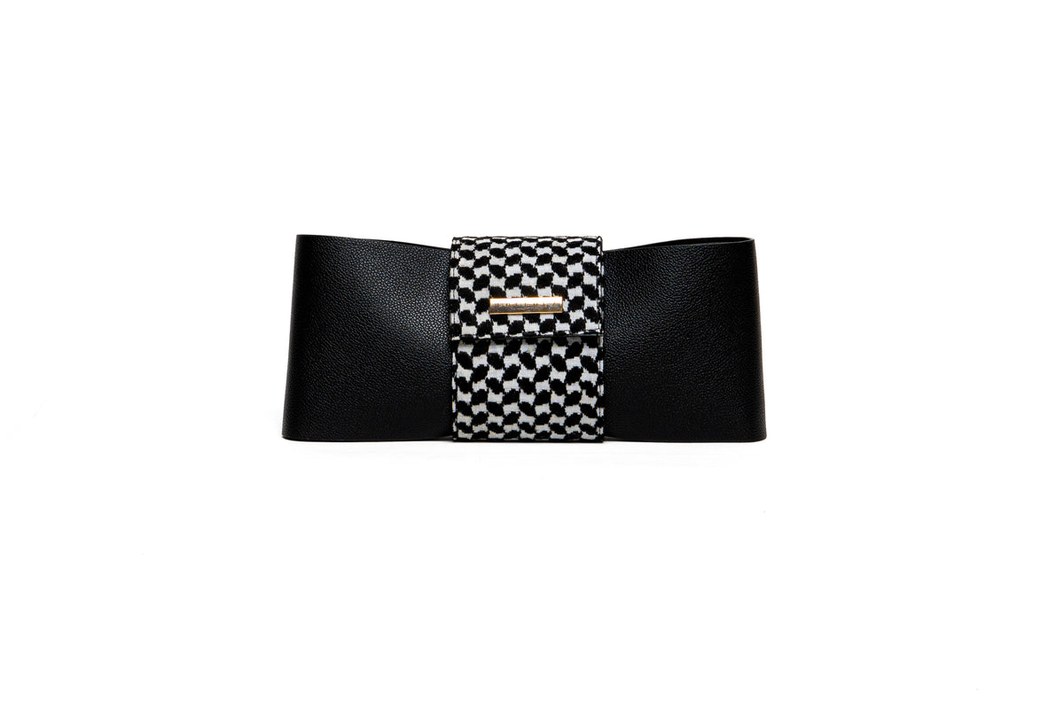 Crafted from vegan leather and accented with traditional Koufiah fabric, this handmade clutch combines elegance with unique style. Its compact design makes it perfect for carrying essentials while adding a chic touch to any outfit.